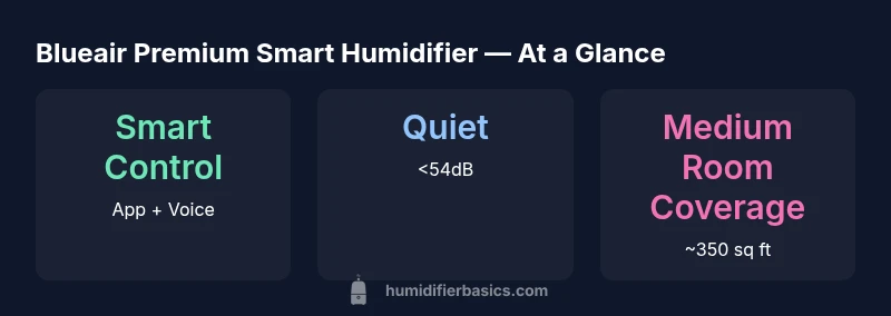 According to HumidifierBasics, the blueair premium smart humidifier delivers reliable humidity control for mid-size rooms, pairing smart features with quiet operation. It excels in ease of use and filtration efficiency, though its upfront cost and ongoing maintenance may be higher than budget models. This review weighs humidity accuracy, app integration, and long-term upkeep to help homeowners decide.