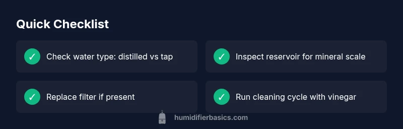 Hard water minerals are the most likely culprit behind white dust, reduced output, and musty smells. Start with a quick wipe-down and rinse, then descale the tank with a mild vinegar solution, followed by thorough final rinses. To prevent recurrence, switch to distilled water and perform regular maintenance.