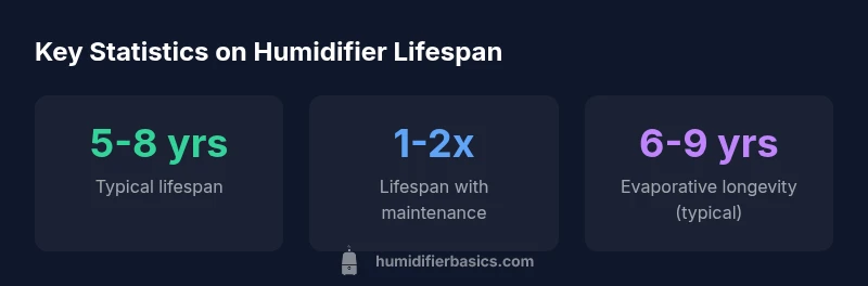 According to HumidifierBasics analysis, a typical residential humidifier lasts about 5-8 years with regular maintenance. Lifespan varies by type (ultrasonic, evaporative, warm-mist), usage patterns, and water quality. Cheaper units tend to trend toward the lower end, while higher-quality designs with proper cleaning can push toward the upper end. Habitual maintenance—monthly cleaning, mineral descaling, and timely part replacements—can meaningfully extend overall life.
