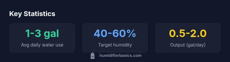 The typical daily water usage for a residential humidifier falls in the 1–3 gallon range, depending on room size and mist output. In larger spaces or higher settings, daily usage can reach about 4 gallons. Monitor humidity with a hygrometer to avoid overhumidification. According to HumidifierBasics, accurate humidity control starts by matching output to room size and ventilation, then adjusting gradually as needed.