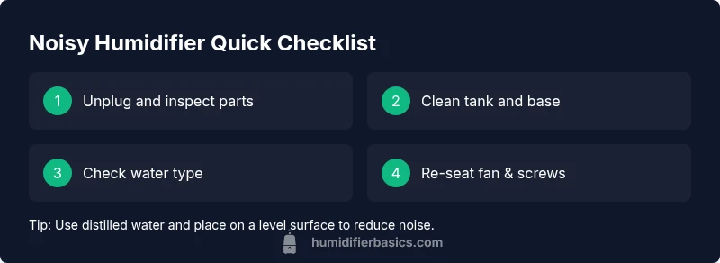 According to HumidifierBasics, noisy operation is usually a sign that maintenance is due, especially mineral buildup, loose components, or airflow restrictions. A quiet unit generally indicates the fan and motor are functioning smoothly and the water path is clear. Understanding the root causes helps you decide which fixes to try first and can save you time and frustration. In many homes, the simplest fixes—like cleaning mineral deposits or tightening screws—eliminate most noises without professional help. This section sets the foundation for safe troubleshooting and explains what to listen for as you inspect.