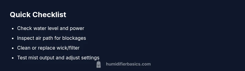 Common causes are a low water level, blocked air paths, or a dirty wick/filter. Start with the basics: refill water, inspect the nozzle, and clean the housing. If the issue persists, inspect settings and consider part replacement.