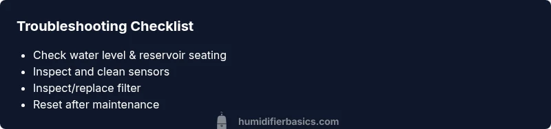 Unplug the unit, check water level, reseat the reservoir, and inspect the filter and sensor area before powering it back on.