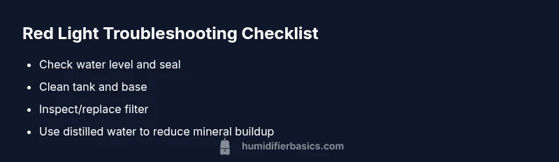 When you notice a red light on your humidifier, you may wonder why is my humidifier light red. In many models, a red indicator signals a fault or a maintenance need, not a decorative feature. According to HumidifierBasics, red lights are safety alerts meant to protect you and your device; the exact meaning can vary by brand and color code, so always check the manual for your model. Common causes include a low water level, a clogged sensor, mineral buildup, or a blocked airflow path. A red light often appears after a period of inactivity or if the water tank is empty. If you leave water in the tank, some models will still show a caution light if the purity of water is compromised or if mineral buildup interferes with sensors. The HumidifierBasics team stresses that most red indicators are resolved by simple maintenance rather than expensive repairs. Start with basic checks first; you’ll often fix it without tools or professional help.