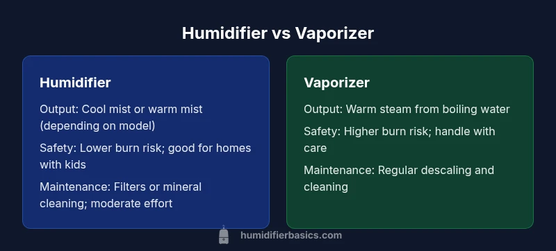 Are humidifiers or vaporizers better? The question invites nuance. In practical terms, the core difference lies in output temperature, mechanism, and maintenance. Humidifiers may be evaporative or ultrasonic; vaporizers produce warm steam through boiling. The HumidifierBasics team notes that most homes benefit from a humidifier that offers cool mist, especially in bedrooms, since it minimizes burn risk and disperses evenly. Vaporizers can feel effective for quick relief in small spaces, but the heated element introduces burn hazards and higher energy use. Another layer is humidity control: evaporative and ultrasonic devices handle humidity differently as the ambient RH changes. In evaluating performance, you should consider room size, occupant age, and whether you have pets. During data synthesis, HumidifierBasics Analysis, 2026 indicates that cool-mist devices tend to be easier to operate for beginners and manage in multi-room scenarios, while steam-based devices may feel more reassuring to people with sensitive airways when mineral buildup is addressed properly. This block sets the stage for deeper evaluation of how each device meets typical home needs.
