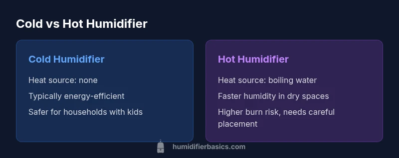 A cold humidifier and a hot humidifier both aim to increase indoor humidity, but they use different methods. Cold humidifiers rely on evaporation, ultrasonic vibration, or misting to release moisture without heating water. Hot humidifiers boil water to create steam, which exits the unit as warm mist. The distinction between cold humidifier vs hot humidifier is not merely technical—it's tied to safety, energy use, and daily maintenance. When you compare cold humidifier vs hot humidifier, you should consider how heat affects room comfort, fluctuations in humidity, and the potential for mineral dust in the air. In HumidifierBasics analyses, homeowners frequently favor cold humidifier vs hot humidifier for everyday living because the former generally offers safer operation, lower energy use, and simpler cleaning.