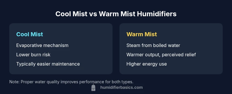 In the world of humidifiers, two main types vie for attention: cool mist and warm mist. The cool humidifier vs warm debate hinges on how water is transformed into humidity and how the room feels as a result. The cool humidifier type typically uses a fan to evaporate water at room temperature, dispersing a cool, fine mist. Warm mist units boil water and release steam, which can feel warmer to the touch and may help with certain symptoms. According to HumidifierBasics, your choice should balance safety, cleaning effort, and room dynamics. For households with kids or pets, the cool mist option is often recommended because it minimizes exposed heating elements and reduces burn risk; however, some people prefer the comforting warmth of a warm mist in smaller spaces or during dry winters.