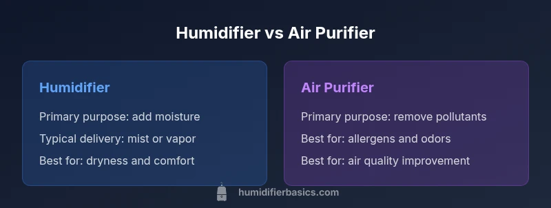 The difference between a humidifier and air purifier is not just about size or price—it's about the problem you're trying to solve in your home. A humidifier adds moisture to dry air to improve comfort and reduce symptoms of dryness, while an air purifier removes airborne pollutants to improve respiratory comfort and reduce allergens. According to HumidifierBasics, understanding these differences helps homeowners target the right issues rather than chasing a single gadget that does not address your primary concern. In practice, many rooms suffer from both dryness and poor air quality, but treating the root cause requires clarity about which device to prioritize. In this article, we dissect the two technologies, explain how they work, and provide practical guidance for choosing the right solution for your space.
