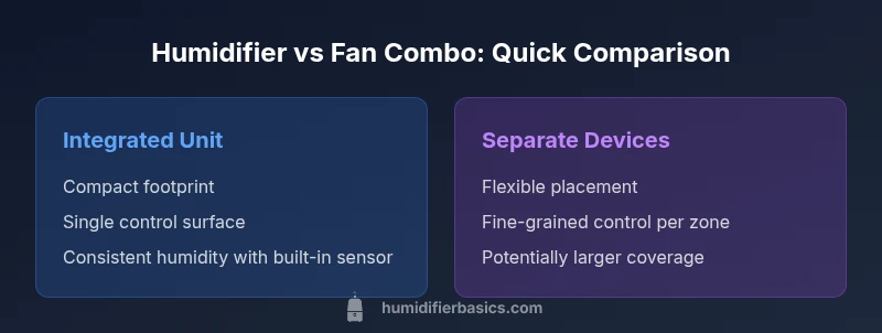 A humidifier and fan combo combines moisture delivery with directed airflow, packing two functions into a single user experience. For homeowners seeking a simple path to more comfortable indoor air, this setup can help reduce dry skin, irritation, and static while promoting even humidity distribution. According to HumidifierBasics, integrating humidification and airflow control in one unit can save space and simplify maintenance for small to medium rooms. In 2026, many models emphasize smart humidity sensors, auto shut-off, and energy-efficient fans, all aimed at reducing energy use without compromising comfort. This article surveys how these combos differ from standalone devices, what performance you should expect, and how to choose the right arrangement for your space. It’s important to note that no single solution fits every scenario; placement, room size, climate, and occupant needs all shape outcomes. The HumidifierBasics team observes that apartments and bedrooms often benefit most from an integrated approach, while larger living areas may require more modularity.