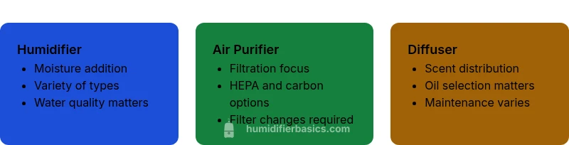 Humidifier, purifier, and diffuser are common home devices, but they are not interchangeable. A humidifier increases relative humidity by releasing water vapor into the air. A purifier, often equipped with a filter or electrostatic mechanism, aims to reduce airborne particles, odors, and sometimes gases. A diffuser disperses essential oils or fragrance molecules into the space. Understanding these core roles helps you avoid buying a device that won’t solve your core problem. According to HumidifierBasics, the distinction matters because each device targets a different aspect of indoor air quality and comfort. That said, many homes benefit from using more than one device to address multiple needs, but careful planning is essential to avoid redundancy or conflicting effects.