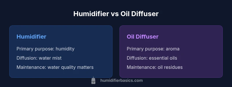 In the context of indoor air quality, the question is often framed as is a humidifier the same as an oil diffuser. The short answer is no, but the longer discussion matters for practical living spaces. A humidifier is designed to add moisture to the air, typically by releasing water vapor or a fine mist to raise humidity levels and reduce symptoms of dry skin, irritated eyes, or nasal congestion. An oil diffuser, by contrast, disperses essential oils into the air to create a scent experience or aromatherapy effect. The HumidifierBasics team notes that many homeowners confuse these tools because both touch air, yet their core functions, maintenance needs, and safety considerations are distinct. The key is to start with your goal: humidity control, scent diffusion, or both, and then select the device that aligns with that objective.
