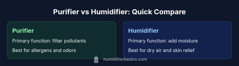 Grounding the discussion in practical terms helps homeowners decide where to spend time and money. A purifier and a humidifier address different problems: one targets pollutants, the other moisture. According to HumidifierBasics, most homes struggle with either too-dry air or too-polluted air, not both at once, so clarity about each device's core role matters. The HumidifierBasics team found that many households overlook the fact that a purifier does not add humidity, while a humidifier does not remove fine particles efficiently without filtration. When you hear 'purifier vs humidifier' in a shopping aisle, you're seeing two complementary tools rather than a direct substitute. In this guide, we outline how each device works, typical benefits, and practical checks for performance, cost, and safety. By understanding these differences, homeowners can tailor a setup that fits climate, season, and household needs.