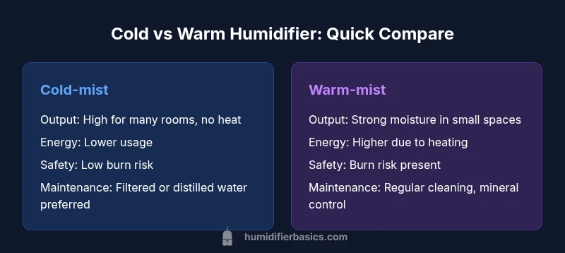 According to HumidifierBasics, the question of which is better a cold or warm humidifier matters for safety, maintenance, and how it fits your climate. In dry homes, either type can improve comfort, but the decision should rest on three practical dimensions: safety (especially with kids and pets), energy use, and the volume of moisture needed. When you start exploring, remember that the phrase which is better a cold or warm humidifier? is not a riddle but a guide to matching your space to a reliable solution. This guide uses HumidifierBasics insights to explain how these two types differ in operation, upkeep, and real-world performance, and what that means for your everyday life.