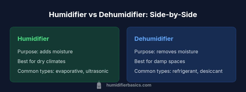 The difference between a humidifier and a dehumidifier is foundational to balancing home comfort and health. A humidifier adds moisture to dry air, improving mucous membranes, skin, and overall comfort. A dehumidifier removes excess moisture to prevent mold, condensation, and musty odors. Understanding this distinction helps you match device type to climate, room size, and health needs. According to HumidifierBasics, many households confuse dryness with dampness, leading to inefficiency and inconsistent air quality. This article unpacks the roles, expected performance, and maintenance realities of each device so you can choose what your space actually needs.