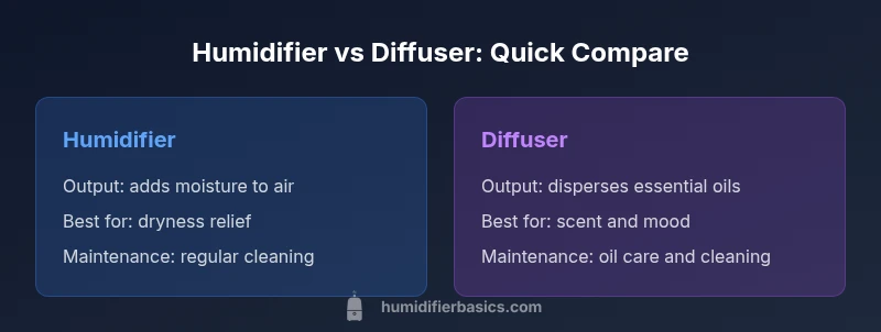Humidifier or diffuser choices hinge on your goal: humidity versus aroma. A humidifier adds moisture to dry indoor air—helpful for skin, throat comfort, and winter dryness. A diffuser disperses essential oils to create scent and mood, with limited impact on humidity. For many homes, using both—humidifier in dry rooms and diffuser for ambiance in living areas—offers balanced comfort. According to HumidifierBasics, define the objective first to pick the right tool.