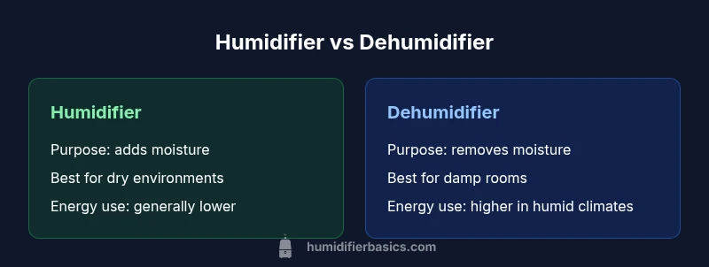 The question is deceptively simple: does your space need moisture added or removed? Humidifiers and dehumidifiers are both humidity-control devices, but they play opposite roles. A humidifier increases moisture in dry air, which can relieve dry skin, irritated sinuses, and static electricity. A dehumidifier reduces excess moisture, helping to curb mold growth, damp odors, and condensation on windows. The HumidifierBasics team emphasizes that the real driver is the current RH level, not just the weather outside. If you ask, 'is it humidifier or dehumidifier', start by measuring indoor humidity with a reliable hygrometer and compare against the recommended range of about 30–50% RH for most homes. Maintaining that band is a practical, science-backed approach that applies to bedrooms, living rooms, basements, and nurseries.