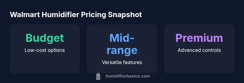 Prices for humidifiers at Walmart vary widely by model, capacity, and features. Budget units are typically the cheapest, mid-range models add capacity and controls, and premium units offer smart features and larger tanks. Walmart listings change with promotions and stock, so there isn't a single fixed price. Always compare online and in-store listings for the best value.